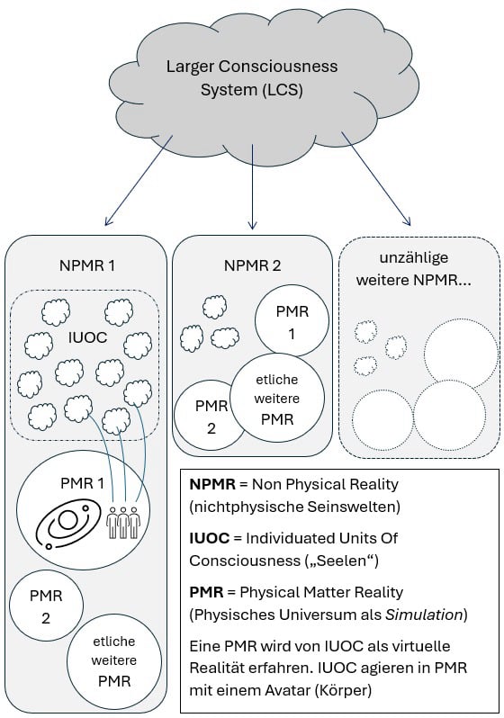 Zur Entwicklung unseres Bewusstseins benötigen wir laut Campbell ein geeignetes Lernumfeld wie etwa unsere physische Welt – eine Umgebung, in der wir durch praktische Entscheidungen unsere Bewusstseinsqualität zum Ausdruck bringen und durch das Lernen aus unseren Fehlern den Wunsch entwickeln können, uns zu verbessern. Entwickeln sich einzelne Bewusstseinsfragmente (IUOC) in Richtung Liebe fort, steigert dies die Bewusstseinsqualität im Gesamtsystem (AUM/LCS). Damit das gelingt, erzeugten spezialisierte Bewusstseinszellen des „Larger Consciousness System“ (LCS) verschiedene Universen als Lernsimulation. Diese simulierten Universen bezeichnet Campbell entweder als „Physical Matter Realities“ (PMR) oder als „Non-Physical Matter Realities“ (NPMR), je nachdem welchen Gesetzmäßigkeiten sie folgen. In PMR sind die Gesetzmäßigkeiten sehr strikt, wie die Naturgesetze unserer physischen Welt. NPMR können wir uns derweil ähnlich wie Traumwelten vorstellen, in denen Raum und Kausalität deutlich flexibler erscheinen. Laut Campbell sind NPMR und PMR ineinander verschachtelt – wie Simulationen innerhalb von Simulationen (siehe Abbildung). Trotz solcher Hierarchien ist keine dieser Realitäten wirklich fundamental – nur Bewusstsein selbst ist fundamental. Es handelt sich also bei PMR nur um virtuelle Räume innerhalb von anderen virtuellen Räumen (NPMR).